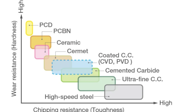 High chemical inertness, even at elevated temperatures Qualified property especially for machining ferrous and high temp alloys.
