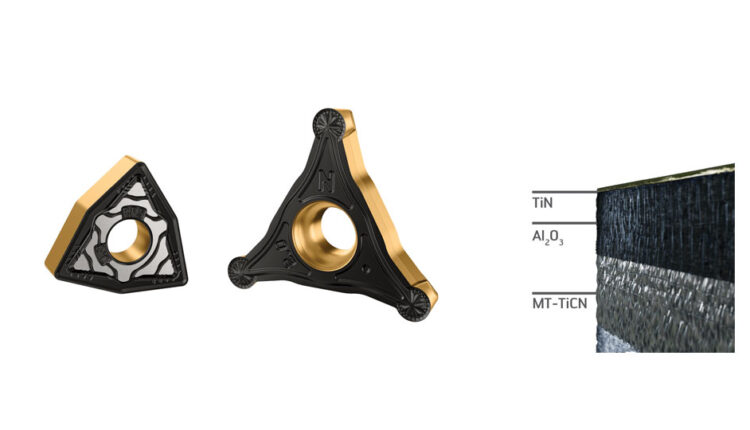 Like the existing inserts, steel is the primary application of the newly added turning grades (cast iron is the secondary application). In 130 customer tests, they increased tool life by an average of around 50%. The reason for this is a special layered structure. A patent-pending, highly textured, multi-layered MT-TiCN layer increases toughness and reduces flank face wear, resulting in lower production costs. The highly textured Al2O3 layer also minimises crater wear; the final gold-coloured top layer improves wear detection.
